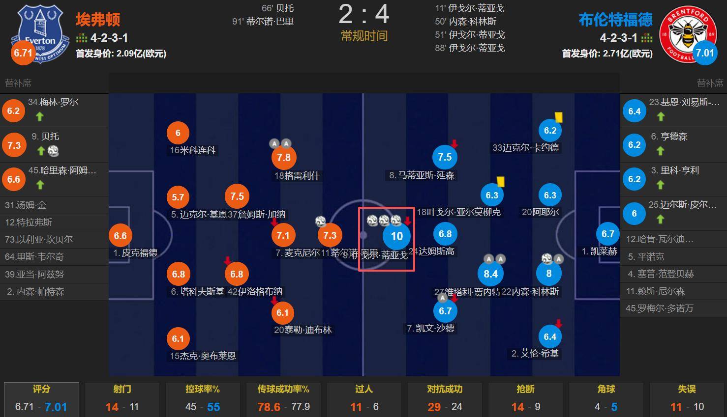 英超第20轮,埃弗顿2-4布伦特福德,伊戈尔-蒂亚戈首发出战,上演帽子戏法,赛后获得全场最高的10.0分(满分)。