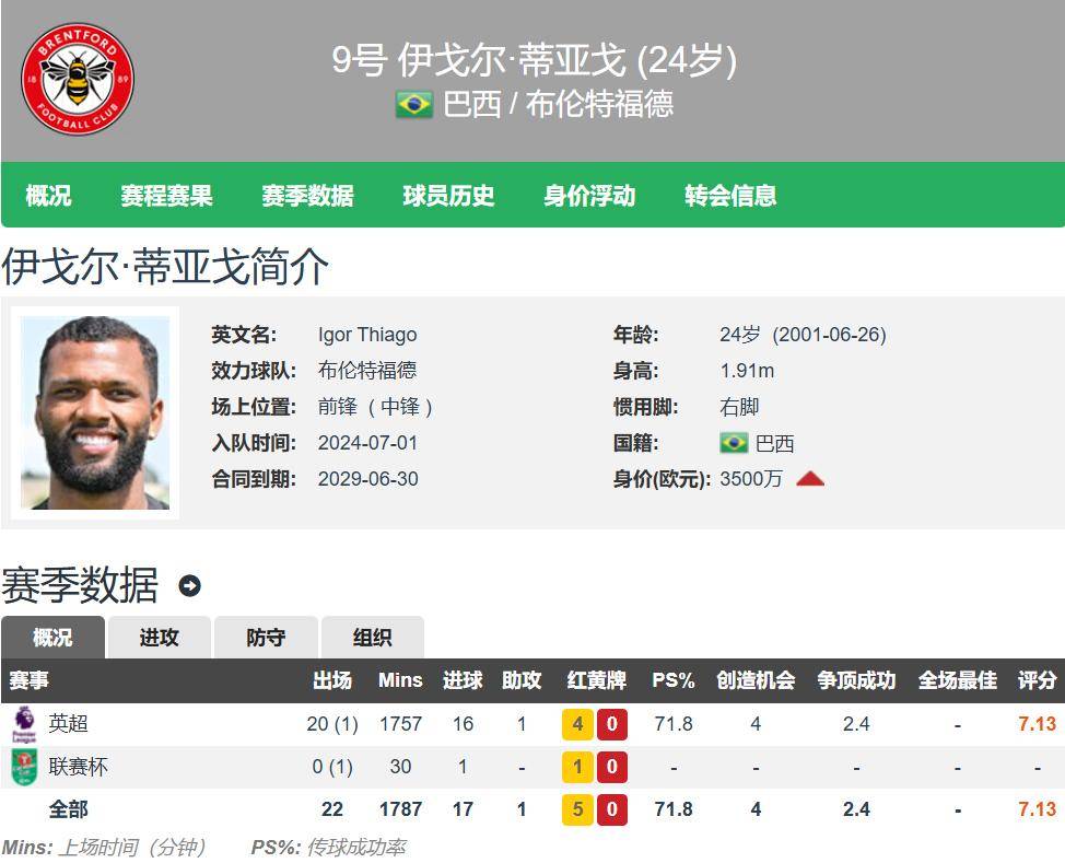 伊戈尔-蒂亚戈现年24岁,球员最好的年纪,身高1.91米,右脚中锋,德转估价3500万欧元,相信下一次更新就会暴涨了。伊戈尔-蒂亚戈出战了本赛季全部的21轮英超,其中20次首发,16球1助,这不比阿森纳中锋约克雷斯、曼联中锋舍什科之辈强太多吗?